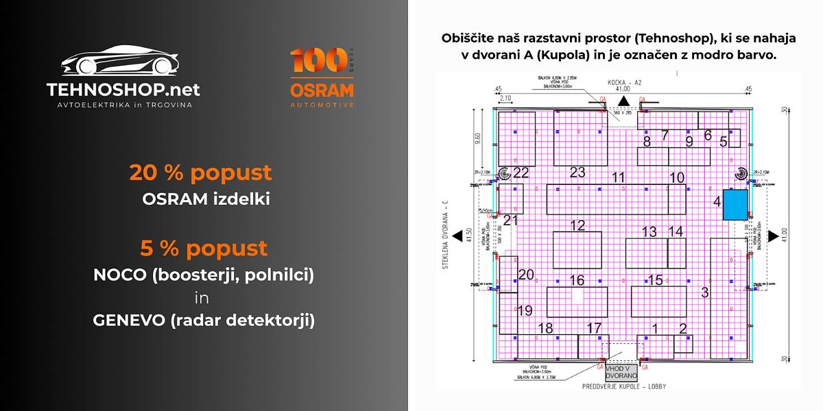 Na Auto Motor Show Ljubljana 2025 bo prisotno tudi naše podjetje Avtoelektrika in trgovina Tehnoshop! Obiščite naš razstavni prostor v HALI A in izkoristite ODLIČNE SEJEMSKE POPUSTE na izdelke priznane blagovne znamke OSRAM, ki že 100 let slovi po inovacijah in predanosti varni vožnji. Kot uradni distributer OSRAM-a vam Tehnoshop v svoji spletni trgovini www.tehnoshop.net ter v poslovni enoti v Črnučah nudimo širok izbor izdelkov in kakovostne storitve avtoelektrike.