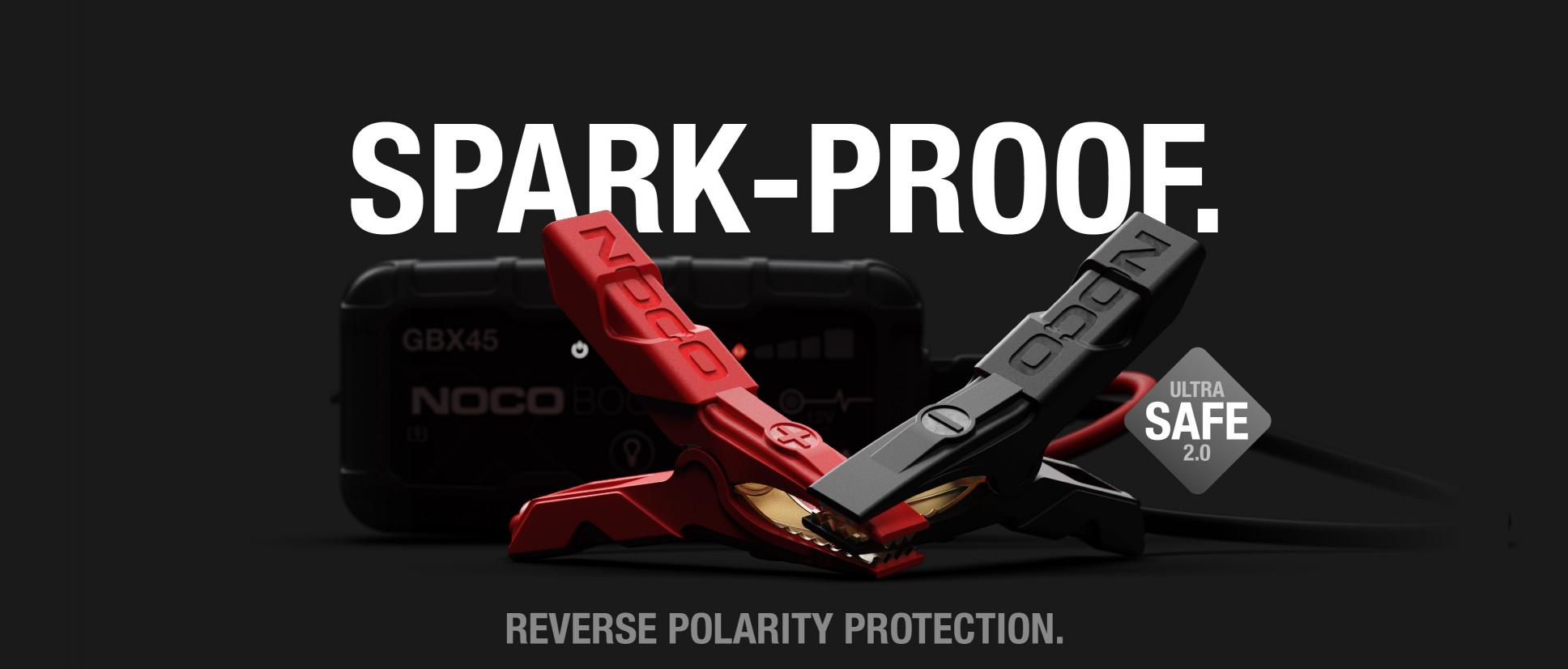 We took our UltraSafe technology and made it better— UltraSafe 2.0. It's still our simple, mistake-free design featuring spark-proof technology and reverse polarity protection, but with enhanced thermal efficiency and power management to provide better performance and longer battery life. The GBX45 from Noco BOOST X series is non-sparking and protected against incorrect connection of the battery terminals (reverse polarity or polarity reversal) and overheating. Furthermore, the GBX45 will not automatically start a vehicle if the battery voltage is 2V or lower. The boost LED will not illuminate and you will need to switch to manual start boost mode. This is an important built-in safety so that a starting boost is not given if the booster is not connected to a battery or if you do not want it.