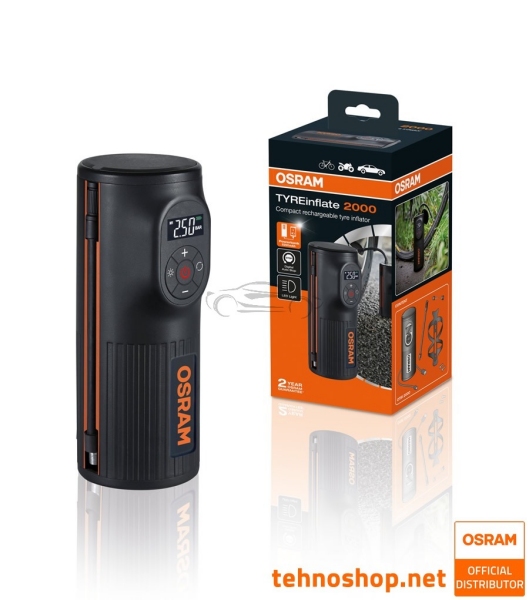 OSRAM TYREinflate 2000 je polnilni zračni kompresor z digitalnim osvetljenim zaslonom za lažje in natančnejše merjenje tlaka in napolnjenosti pnevmatik, ki prikazuje vrednosti tlaka v BAR, kPA in PSI. OSRAM TYREinflate 2000 ima notranji pomnilnik in zahvaljujoč spominski funkciji je mogoče programirati in shraniti do štiri različne vrednosti za različne pnevmatike. Opremljen je tudi s funkcijo samodejne zaustavitve: OSRAM TYREinflate 2000 se samodejno ustavi, ko je dosežen pravilen in vnaprej nastavljen tlak. Prek priloženega kabla USB je OSRAM TYREinflate 2000 mogoče polniti in za napajanje ni potrebna vtičnica 12 V, tako da ni samo za polnjenje avtomobilskih pnevmatik, ampak se lahko uporablja tudi za polnjenje pnevmatik koles, skuterjev in motociklov. Zaradi lahke in kompaktne zasnove je OSRAM TYREinflate 2000 idealen za uporabo na poti in ga lahko vzamete skoraj povsod. S priloženo vrečko za shranjevanje preprosto shranite v predal avtomobila, torbo ali nahrbtnik. Priložen je nosilec za pritrditev in shranjevanje na kolo. Zahvaljujoč powerbank-funkciji se lahko OSRAM TYREinflate 2000 uporablja tudi kot polnilec za elektronske naprave, kot je npr. mobilni telefon. Poleg tega lahko vgrajena funkcija svetilke zagotovi osvetlitev ponoči ali v slabih svetlobnih pogojih. Priložen je tudi 2-delni komplet adapterjev, ki se lahko uporablja kot priključek za kolesa, žoge, čolne in druge izdelke z ventili Presta.