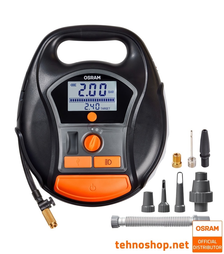 OSRAM Tyreinflate 6000 je hiter digitalni kompresor, za polnjenje pnevmatik, z osvetljenim digitalnim zaslonom za enostavno in natančno odčitavanje tlaka.Vključuje funkcijo samodejnega zaustavljanja, da enostavno dosežete natančno želeni tlak potreben za polnjenje pnevmatik. Samodejna nastavitev tlaka na Tyreinflate 6000 je neverjetno enostavna - samo obrnite gumb na želeni tlak, kliknite za nastavitev in pritisnite start. Kompresor se samodejno ustavi, ko je dosežen pravilen tlak. Električni kabel za navijanje odpravlja neurejene žice. Napajalni kabel je dovolj dolg (3,5 m), da doseže vse pnevmatike okoli vašega vozila. Poleg tega ima vgrajeno tudi litionsko baterijo, kar omogoča uporabo tudi brez priključenega napajalnega kabla, zaradi česar je idealen spremljevalec za kampiranje in izlete. Velik gumb za vklop / izklop in LED usmerjena luč omogočata Tyreinflate 6000 enostavno uporabo v temi in izrednih razmerah - tako da ste pripravljeni na vse, kar se lahko zgodi na cesti. Digitalni kompresor pnevmatik OTIR6000 lahko napolni pnevmatiko v samo dveh minutah in ima posebno nastavitev za druge napihljive izdelke iz gume, kot so zračne postelje, zračne blazine, žoge in drugo. Zahvaljujoč funkciji powerbank se lahko OSRAM TYREinflate 6000 uporablja tudi kot polnilec za elektronske naprave, kot je mobilni telefon. Priložen je tudi 10-delni komplet adapterjev, torba za shranjevanje in rezervni pokrovčki za ventile.